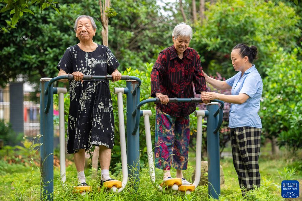 6月20日,工作人員(右一)輔助老年人在漢壽縣社會(huì )福利中心健身。
