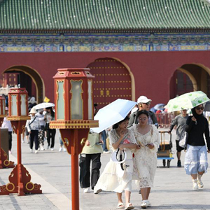 6月23日,在北京天壇公園,出行的游客撐傘抵擋強烈的陽(yáng)光。