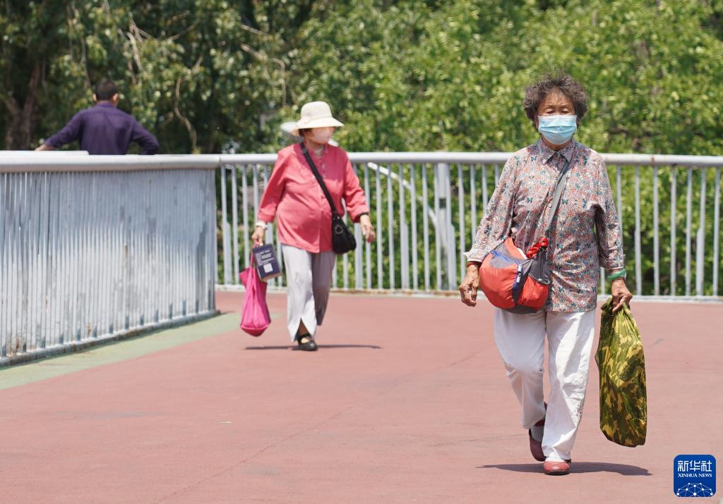 6月23日,市民午間行走在位于北京市海淀區北太平橋附近的天橋上。