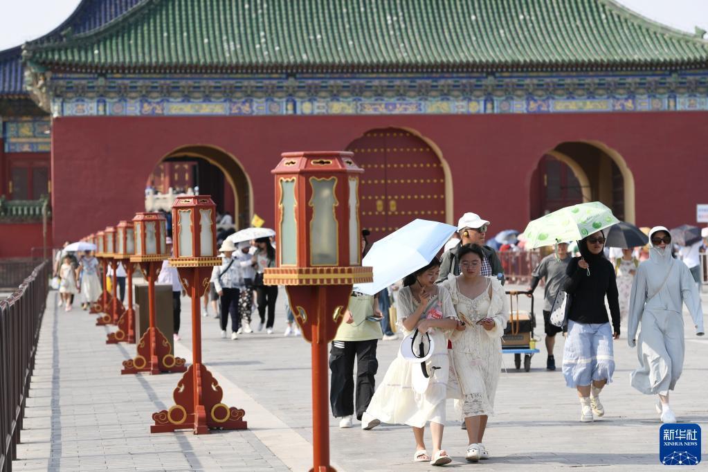 6月23日,在北京天壇公園,出行的游客撐傘抵擋強烈的陽(yáng)光。