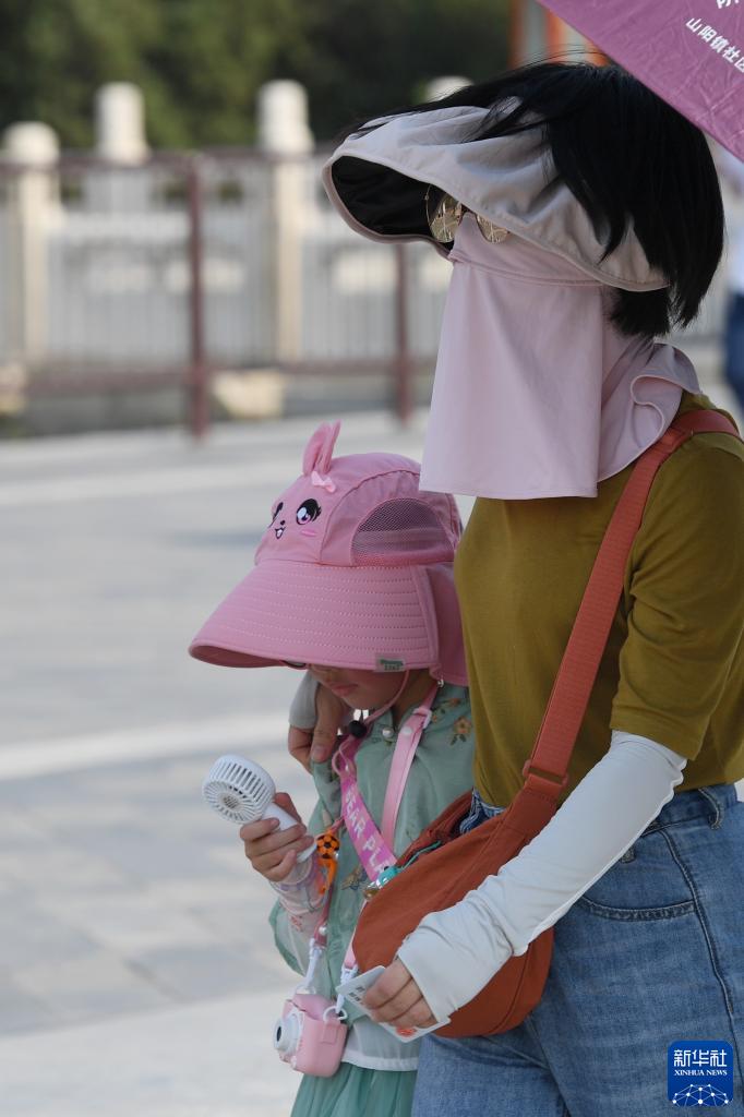 6月23日,在北京天壇公園,一位家長(cháng)帶著(zhù)孩子游覽觀(guān)光,家長(cháng)頭上戴著(zhù)帽子和防曬口罩遮擋陽(yáng)光。