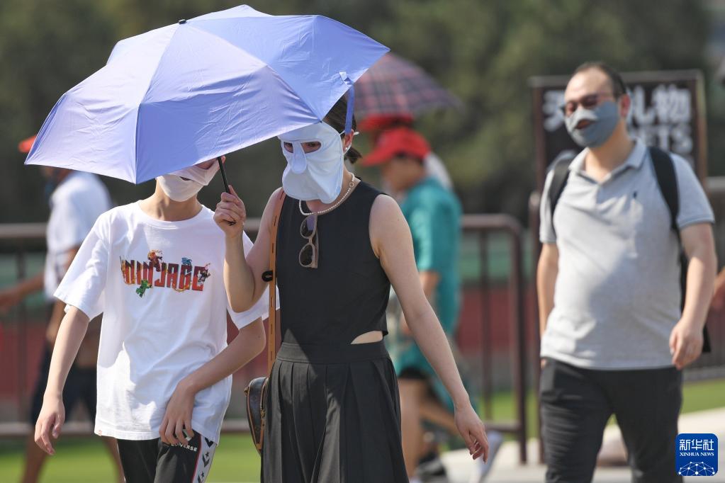 6月23日,在北京天壇公園,出行的游客撐傘抵擋強烈的陽(yáng)光。