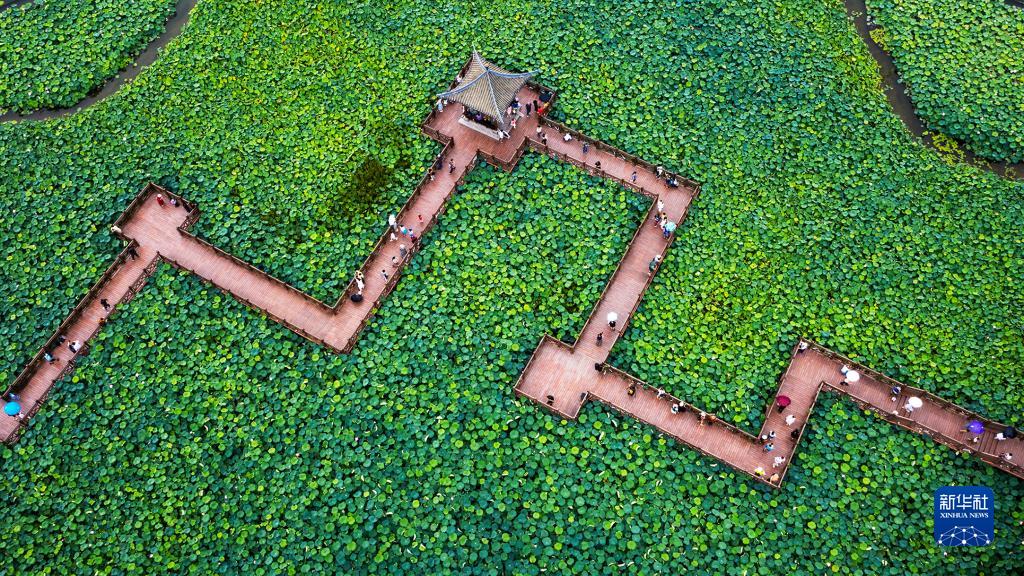 6月24日,游人在廣西南寧市南湖公園觀(guān)賞荷花(無(wú)人機照片)。