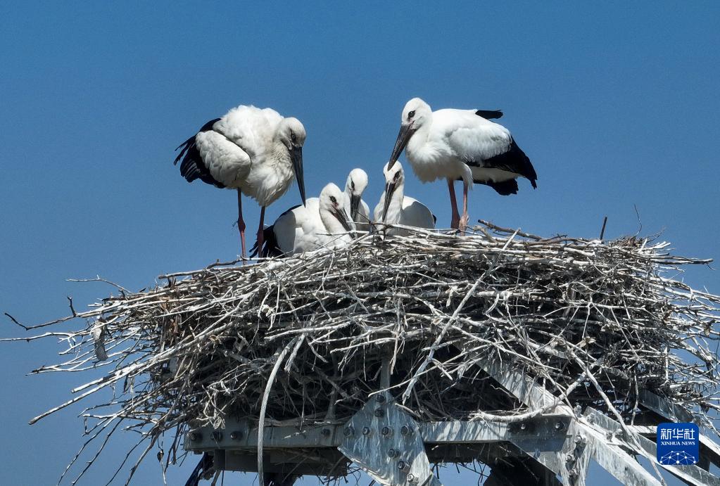 近日,在河北省唐山市豐南區黑沿子鎮沿海濕地附近的高壓電線(xiàn)鐵塔上的巢穴中,新孵化出的近30只東方白鸛幼鳥(niǎo)羽翼漸豐,它們在成年?yáng)|方白鸛的看護下茁壯成長(cháng)。據介紹,隨著(zhù)當地政府不斷加大環(huán)境治理和生態(tài)功能修復力度,東方白鸛的棲息地從最初的黑沿子鎮逐步向周邊擴大,轄區內沿海濕地也成為國家一級保護動(dòng)物東方白鸛的重要棲息地。