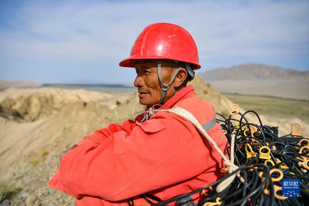東方物探公司塔里木物探處2170隊放線(xiàn)班組53歲的工人善從余在運送檢波器途中(6月20日攝)。