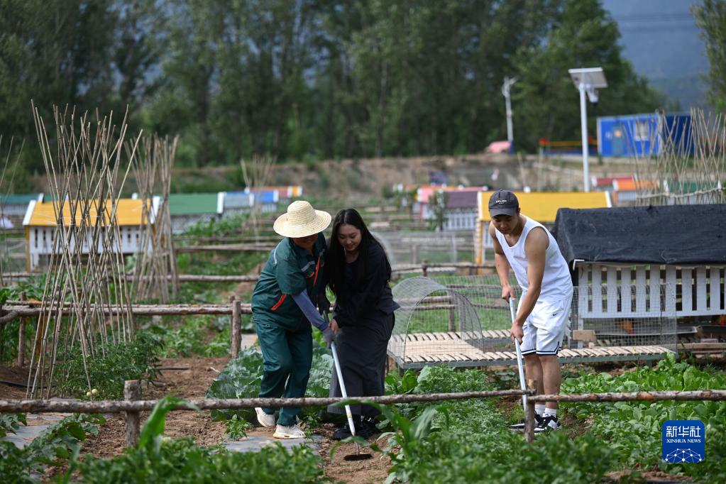 6月25日,在隆化縣苔山鎮三道營(yíng)村一家“共享農場(chǎng)”,市民在工作人員的指導下勞作。