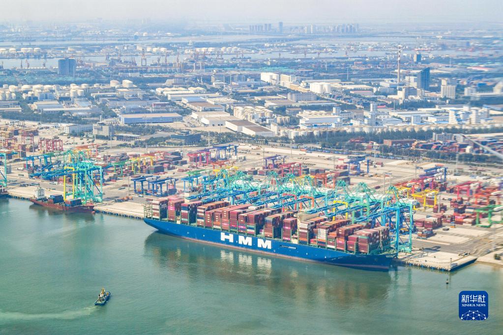 這是6月16日從直升機上拍攝的一艘??吭谔旖蚋郾苯蹍^C段智能化集裝箱碼頭的集裝箱貨輪。