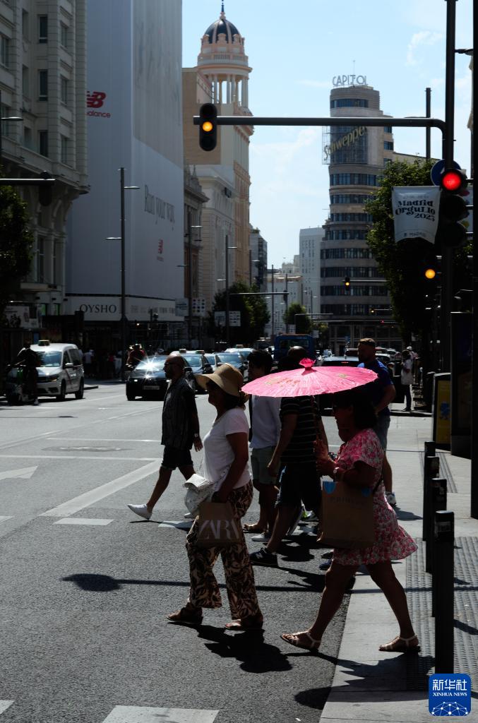 6月25日,一名女子撐傘走過(guò)西班牙馬德里市中心。
