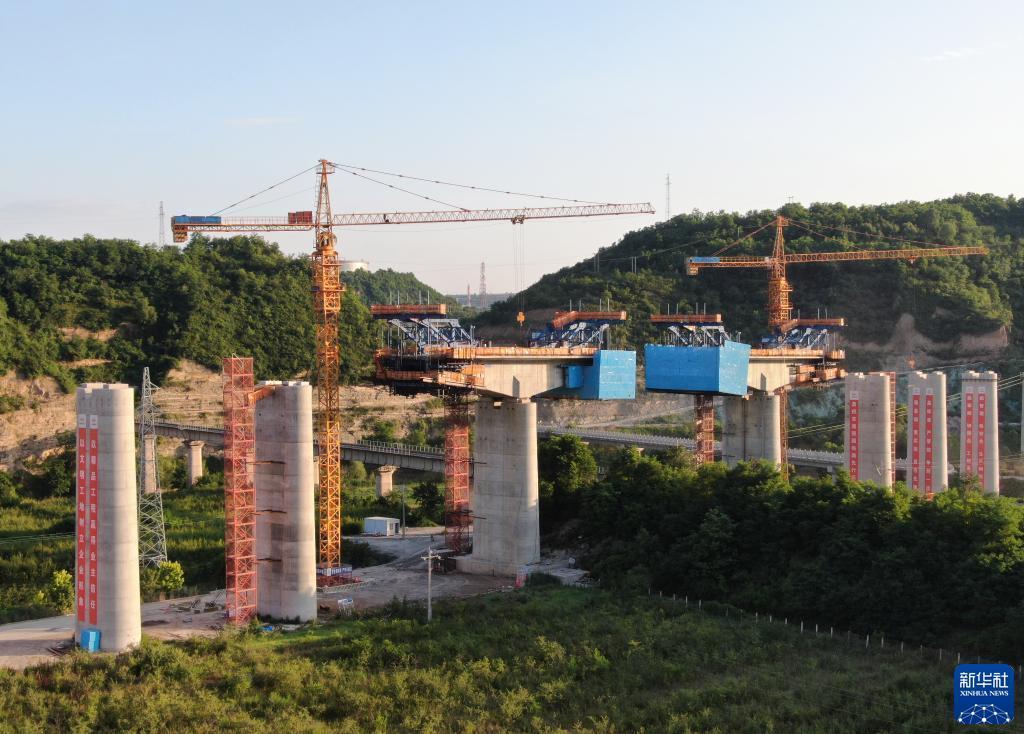 這是位于延安市洛川縣的西延高鐵XYZQ-8標段交口鎮北洛河特大橋施工現場(chǎng)(6月25日攝,無(wú)人機照片)。