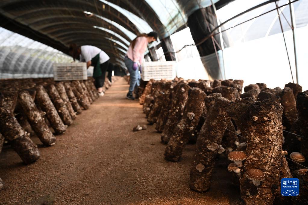 6月26日,農民在隆化縣章吉營(yíng)鎮一處食用菌大棚采摘香菇。