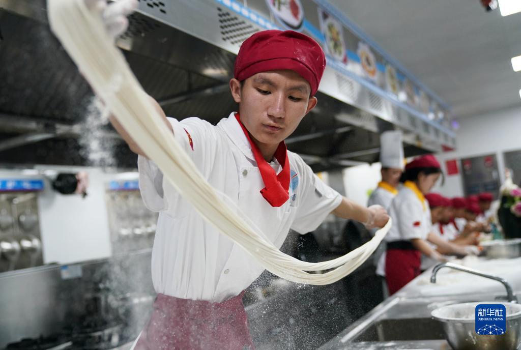 6月25日,在位于西安市藍田縣的藍田廚師學(xué)校中式面點(diǎn)實(shí)訓室,學(xué)生在練習制作面條。