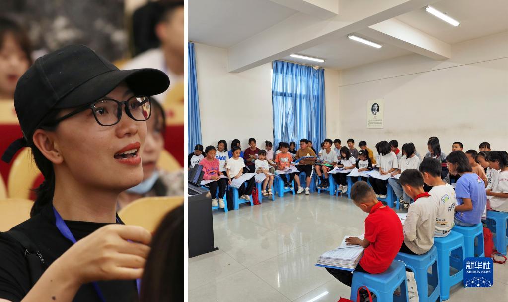 這是一張拼版照片:左圖為6月23日,云南省玉溪市江川區九溪鎮馬家莊小學(xué)的音樂(lè )教師普海玲在培訓課上(新華社記者劉穎攝);右圖為馬家莊小學(xué)的若水童聲合唱團在排練,該校僅有120多名學(xué)生,但組成的合唱團曾在國內和國際的合唱比賽中獲獎(受訪(fǎng)者供圖)。