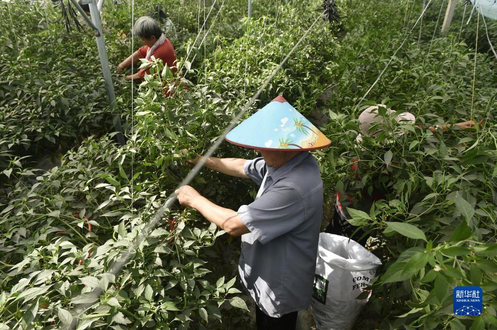 6月26日,村民在河南省安陽(yáng)市內黃縣梁莊鎮馮莊村的大棚里采摘辣椒。