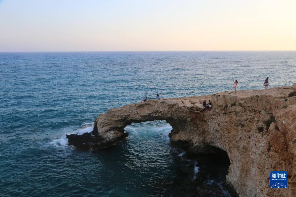在塞浦路斯圣納帕東部海蝕洞景區,一處海岸邊海水侵蝕后形成的天然石橋“愛(ài)之橋”因美麗的景色成為游客打卡地。