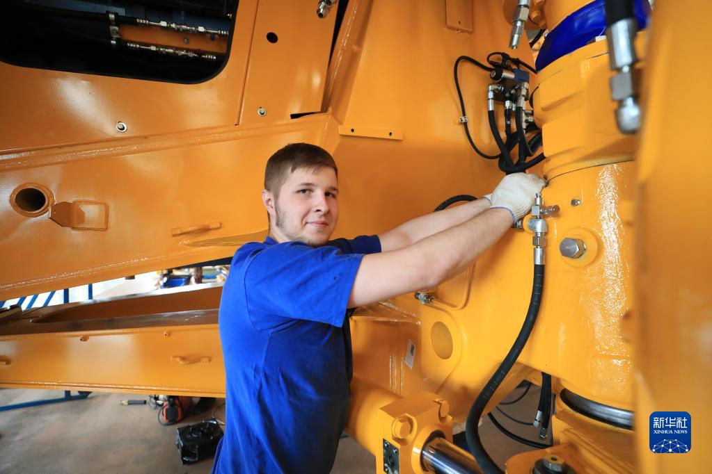 6月26日,工人在白俄羅斯明斯克州若基諾市的白俄羅斯汽車(chē)制造廠(chǎng)大型自卸車(chē)組裝車(chē)間工作。