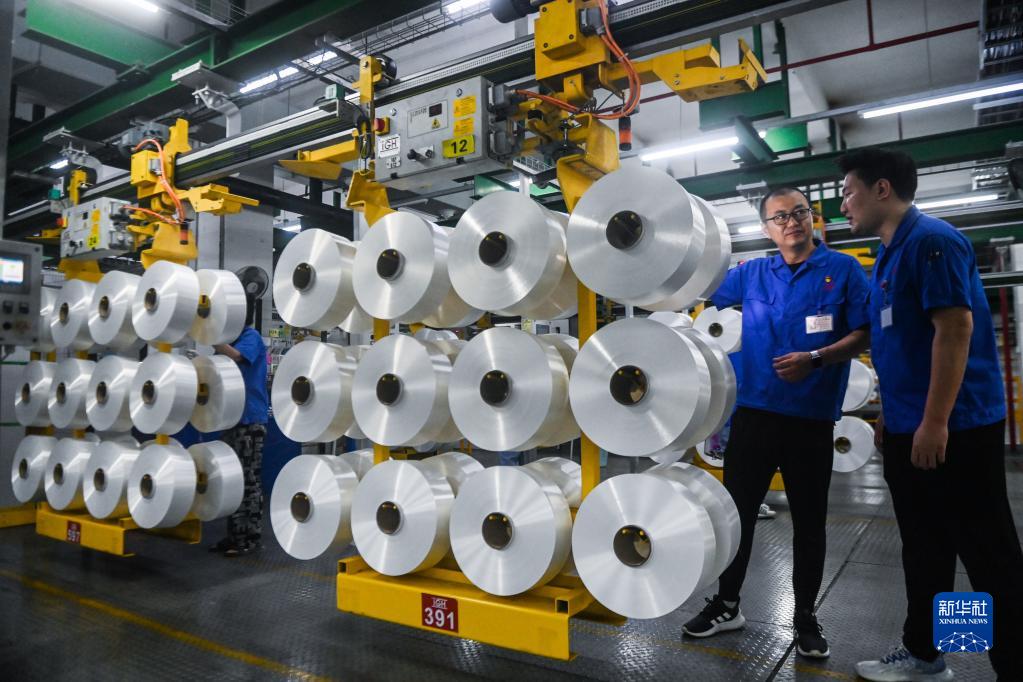 6月27日,在桐昆集團浙江恒超化纖有限公司聚紡車(chē)間內,黨支部書(shū)記戚黎洲(左)指導新員工學(xué)習質(zhì)檢流程及要點(diǎn)。