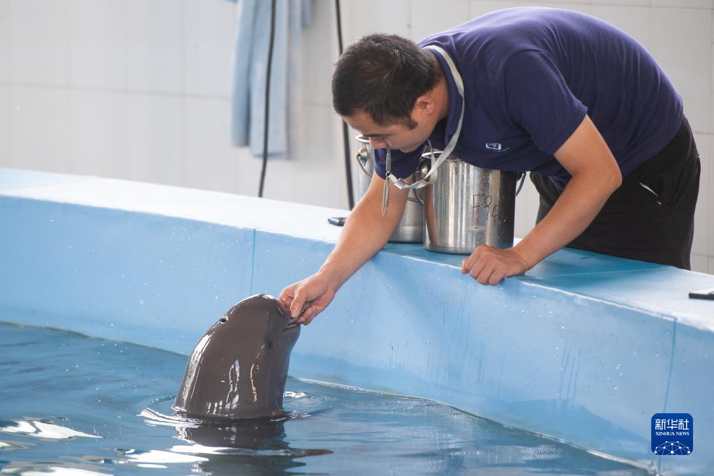 6月27日,中科院水生所白鱀豚館飼養員給小江豚“F9C22”喂食。