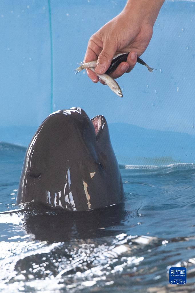6月27日,中科院水生所白鱀豚館飼養員給小江豚“F9C22”喂食。