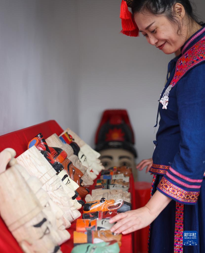 6月27日,在廣西環(huán)江毛南族自治縣下南鄉毛南民族文化園,身著(zhù)毛南族服飾的婦女觀(guān)賞毛南族儺面具。