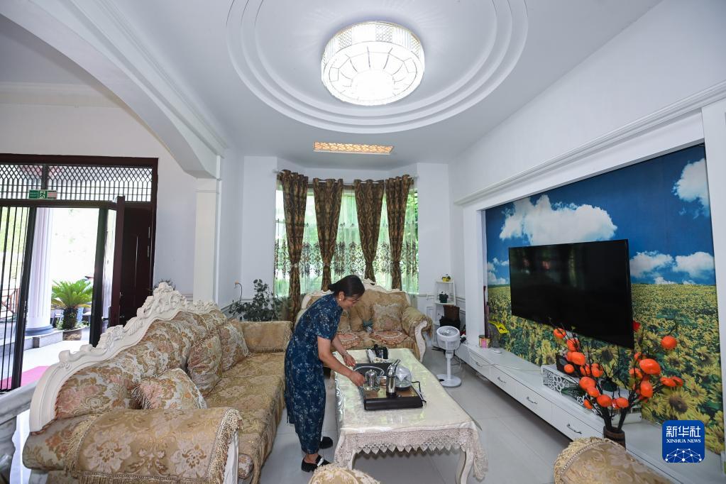 6月27日,浙江省建德市航頭鎮航川村的民宿主在整理民宿客廳。