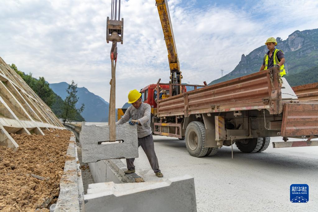 6月27日,在巫鎮高速公路二標段施工現場(chǎng),施工人員在搬卸排水溝蓋板。