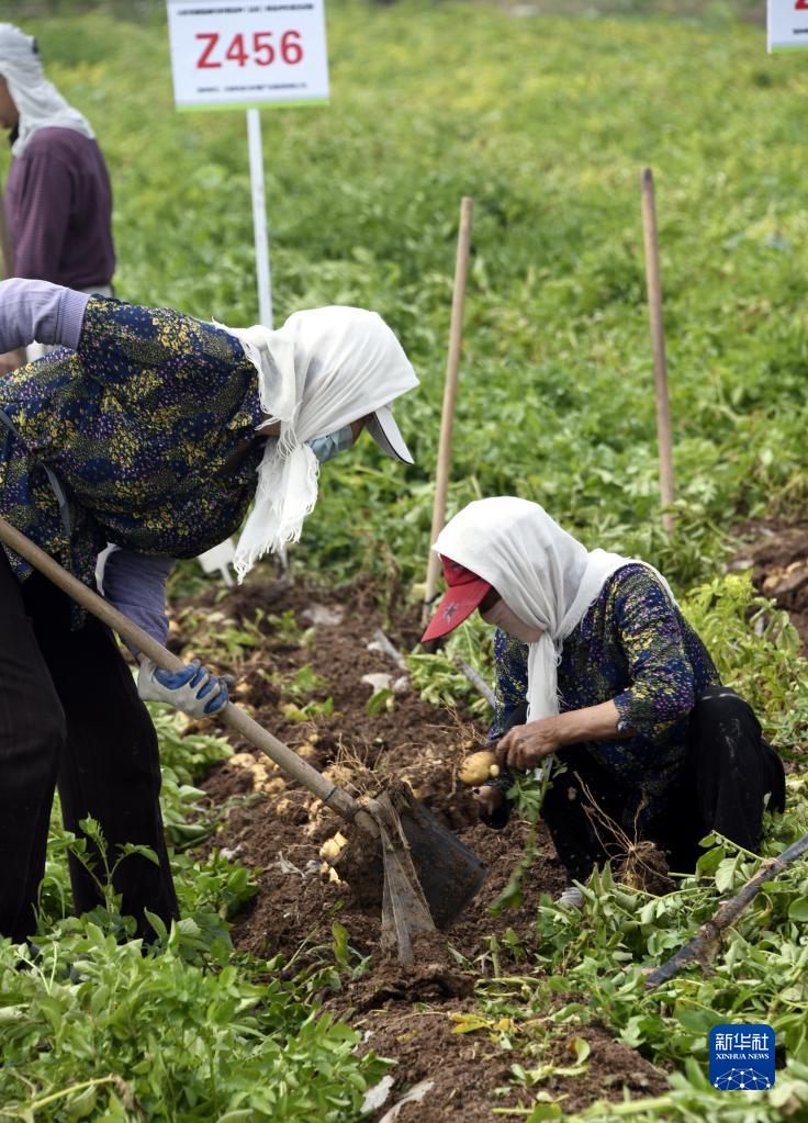 6月27日,工作人員在示范基地收獲馬鈴薯。