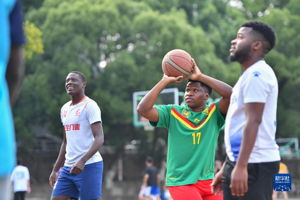 在中南大學(xué)體育場(chǎng),何?。ㄓ叶┖屯瑢W(xué)一起打籃球(6月14日攝)。