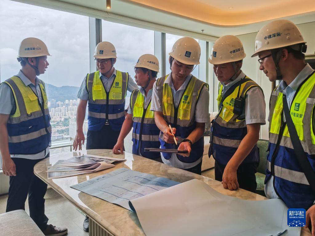 伍濤(左二)和同事在施工現場(chǎng)對整體施工效果和設計方案還原程度進(jìn)行比對(6月26日攝)。