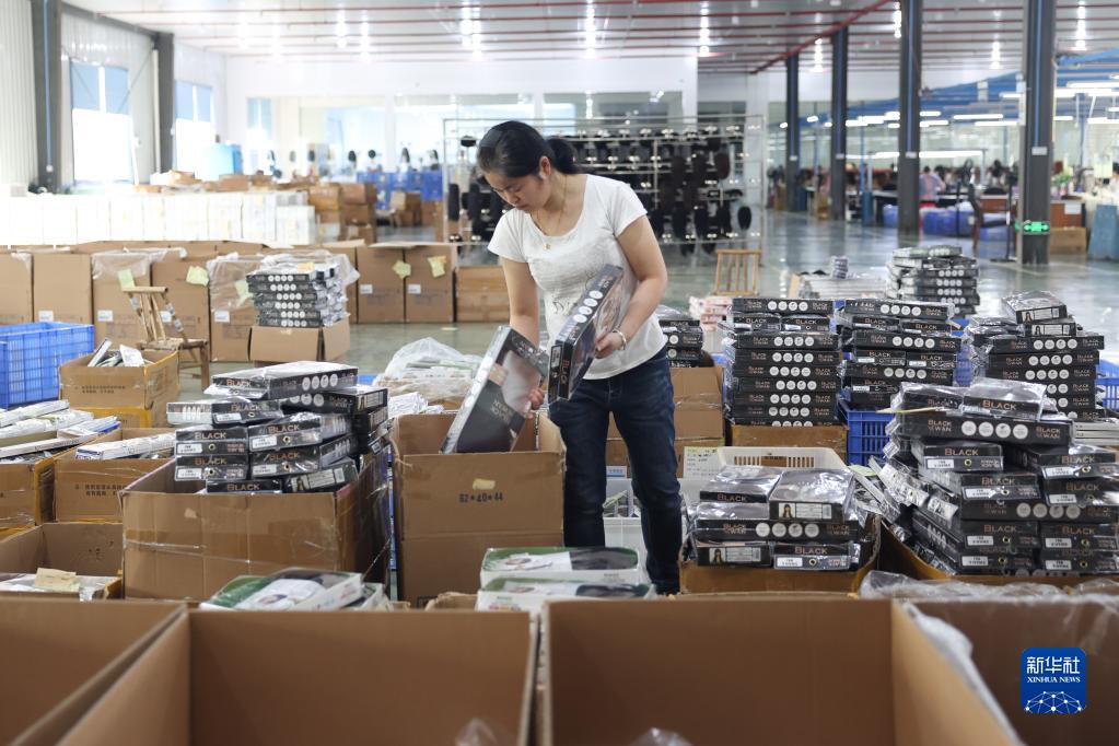 5月25日,工人在湖南邵陽(yáng)陽(yáng)光發(fā)品有限公司車(chē)間打包假發(fā)產(chǎn)品。