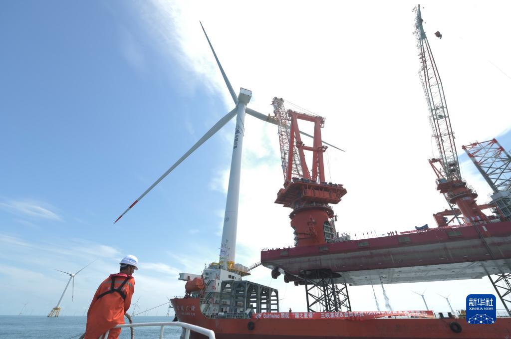 6月28日拍攝的全球首臺16兆瓦海上風(fēng)電機組吊裝現場(chǎng)。