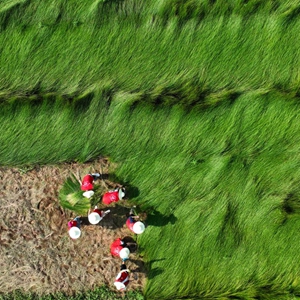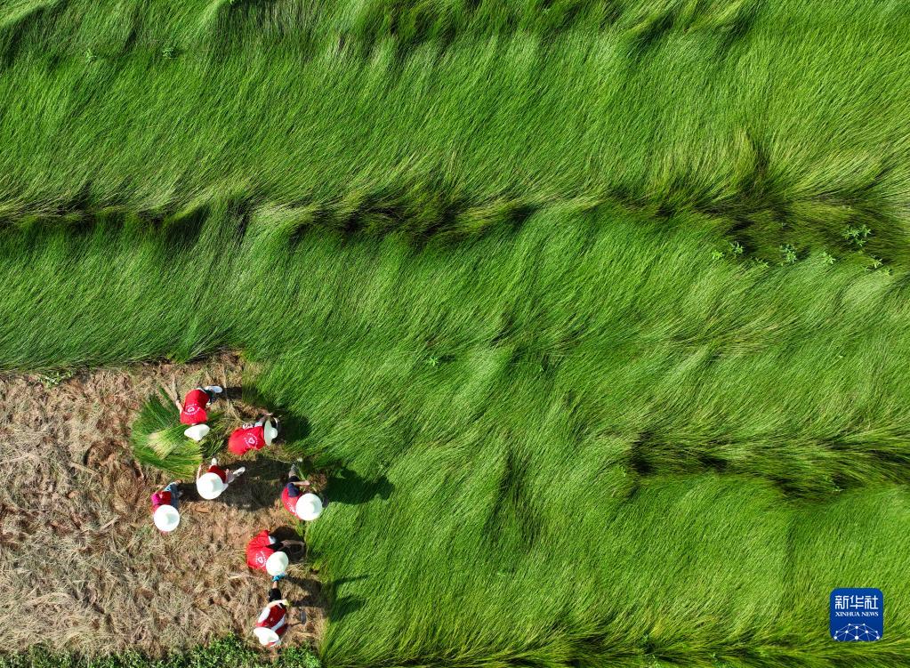 6月28日,在湖南省衡陽(yáng)市祁東縣金橋鎮,南華大學(xué)電氣工程學(xué)院的志愿者在收割藺草(無(wú)人機照片)。