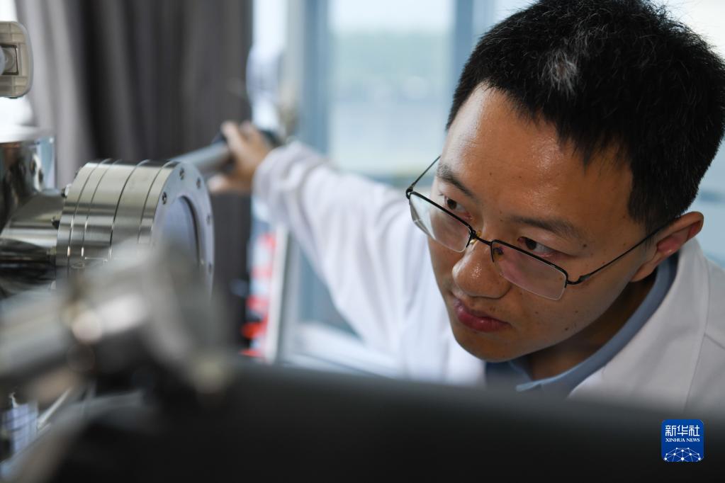 6月28日,在中科院合肥物質(zhì)科學(xué)研究院強磁場(chǎng)科學(xué)中心實(shí)驗室,郝林向脈沖激光分子束外延系統中傳送樣品。