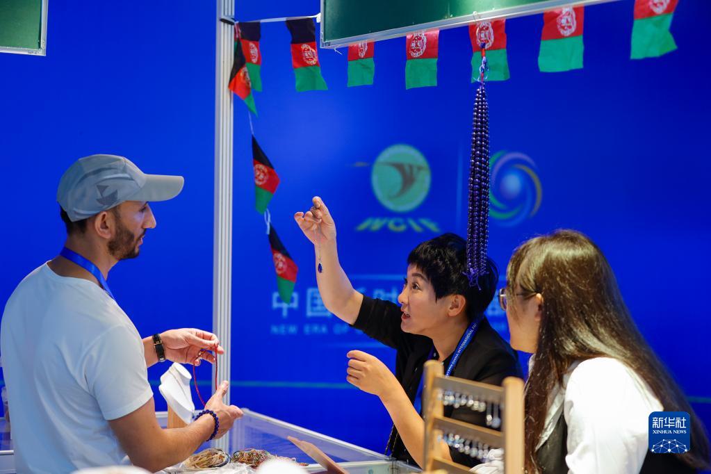 6月29日,在第十九屆中國西部國際博覽會(huì )“一帶一路”國際合作館的阿富汗展區,參觀(guān)者向阿富汗客商了解青金石飾品價(jià)格。