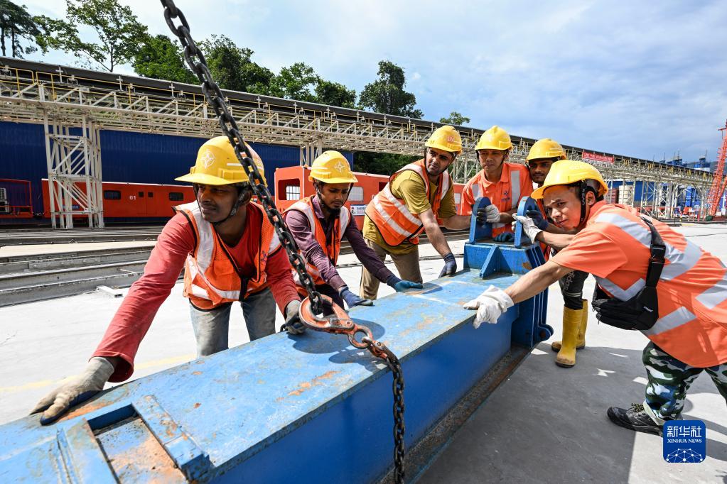 6月28日,在位于馬來(lái)西亞彭亨州的馬東鐵項目云頂隧道施工現場(chǎng)附近,幾名工人合力作業(yè)。