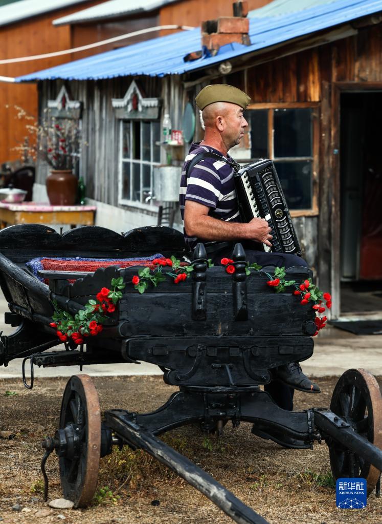 6月28日,薩沙在表演拉手風(fēng)琴。薩沙的嫂子考占花是俄羅斯族,2004年開(kāi)始經(jīng)營(yíng)俄羅斯族家庭游。