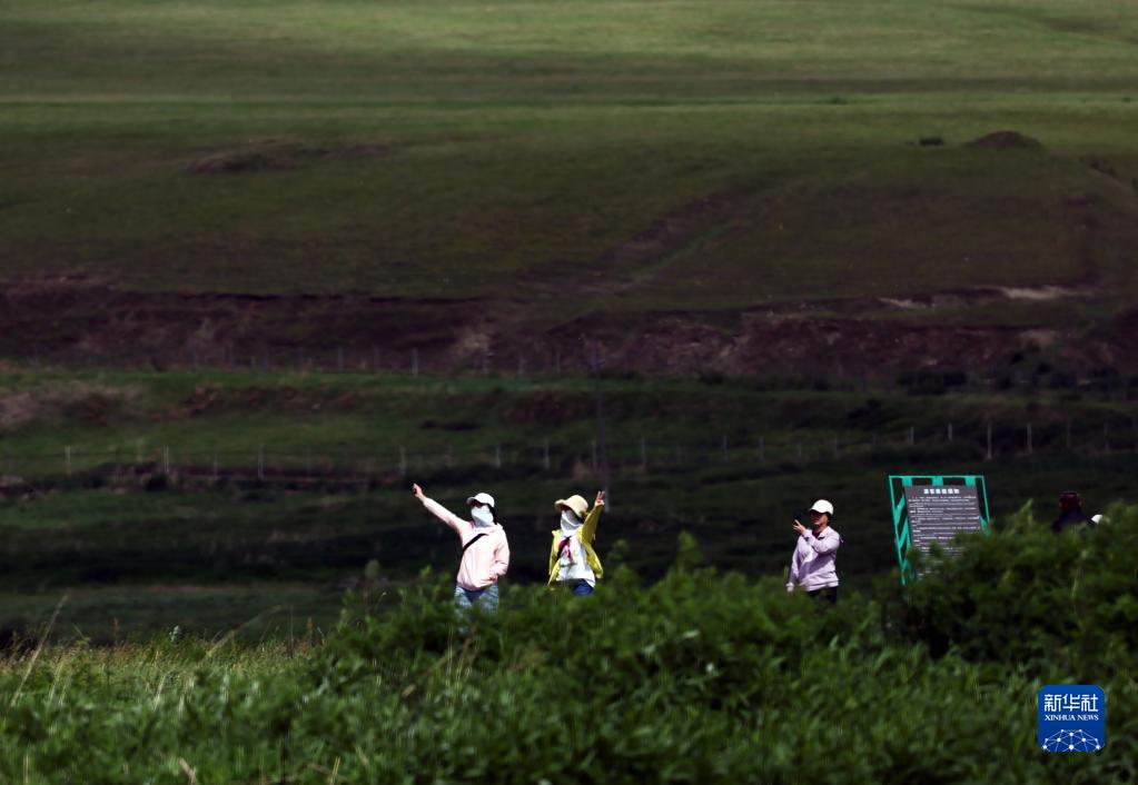 6月29日,游客在蒙兀室韋蘇木一處游船碼頭附近拍照。