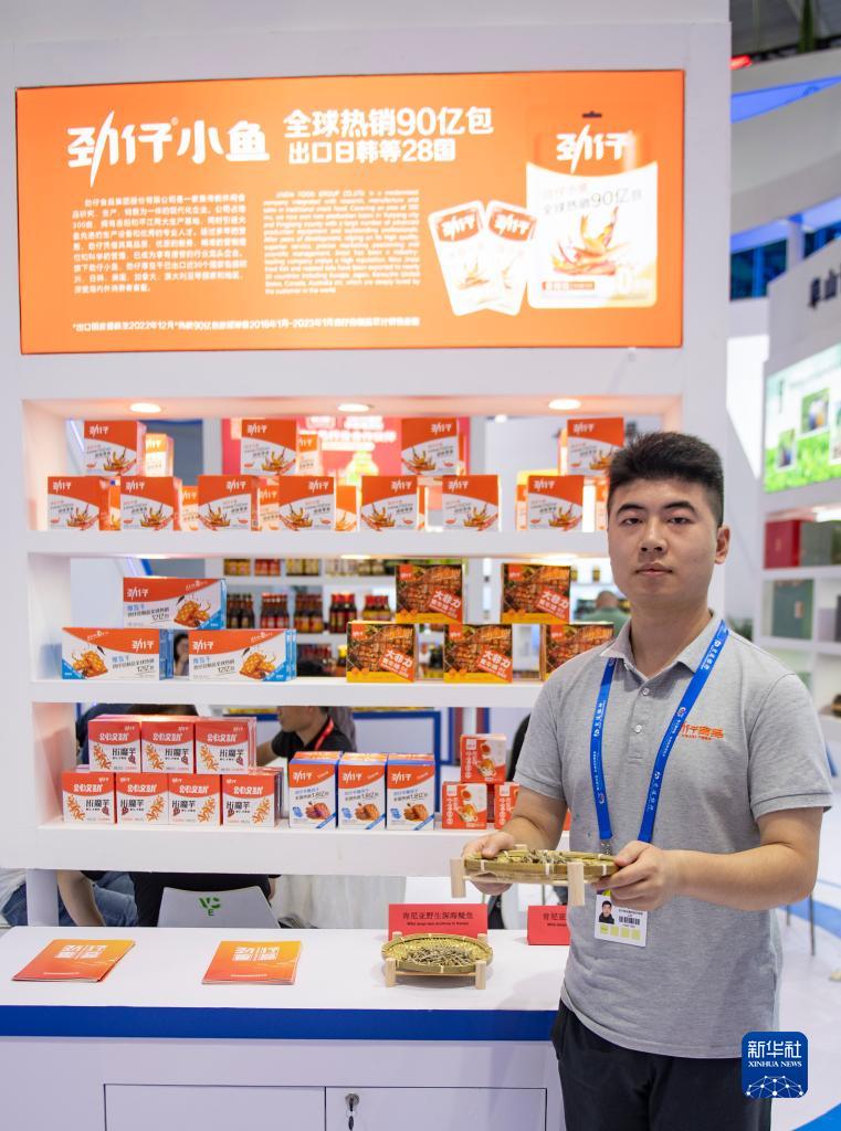 在第三屆中非經(jīng)貿博覽會(huì )主展館長(cháng)沙國際會(huì )展中心,工作人員展示肯尼亞野生鳀魚(yú)產(chǎn)品(6月29日攝)。新華社記者 孫瑞博 攝