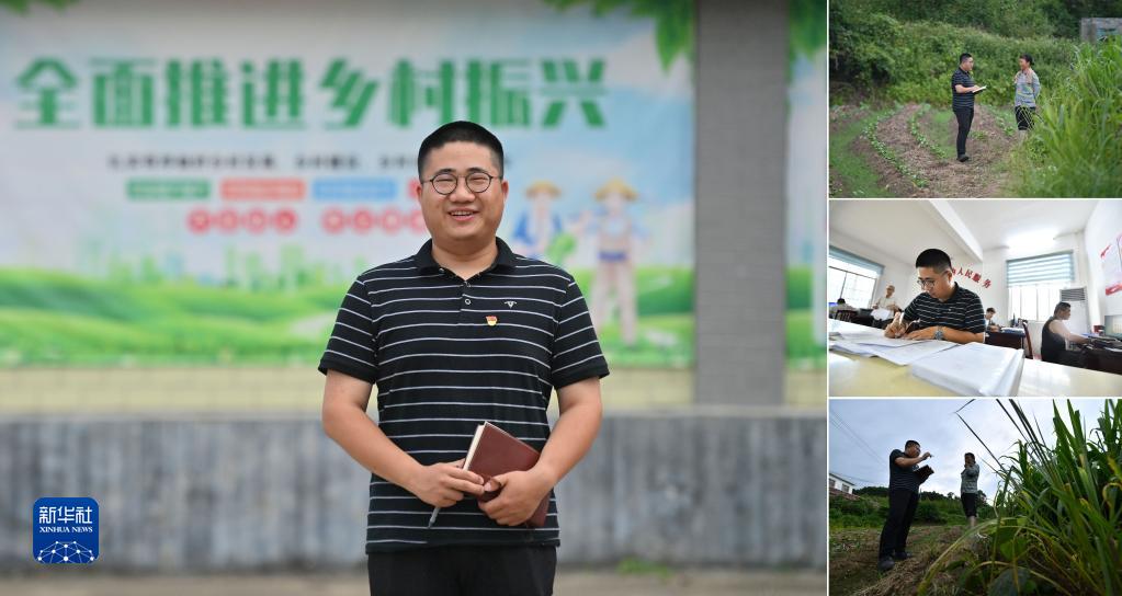 拼版照片:左圖為廣西鹿寨縣鹿寨鎮思洛村23歲的黨員譚梓祥;右圖為譚梓祥在村里開(kāi)展各項工作(照片均攝于2023年6月13日)。