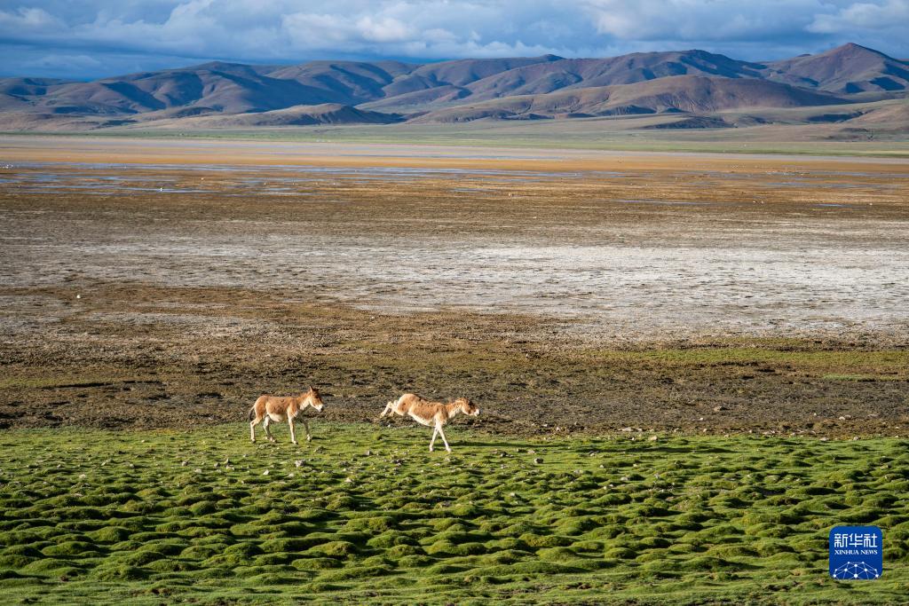 在哲古草原上嬉戲的藏野驢(6月28日攝)。
