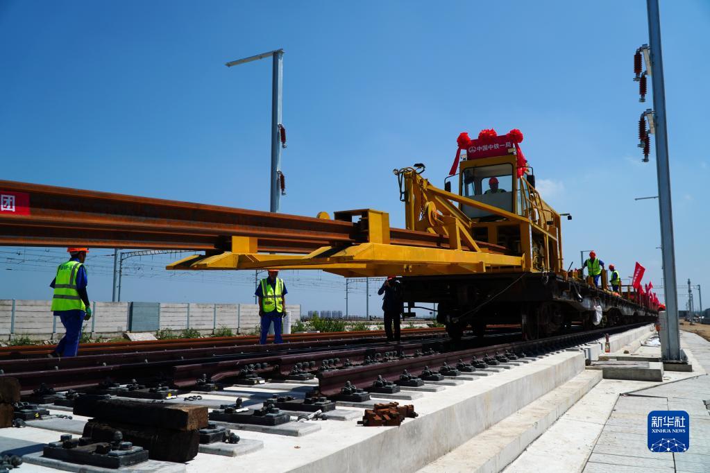 6月30日,在位于山東省煙臺市蓬萊區的濰煙高鐵施工現場(chǎng),中鐵一局鋪軌機組施工人員在進(jìn)行鋪軌作業(yè)。