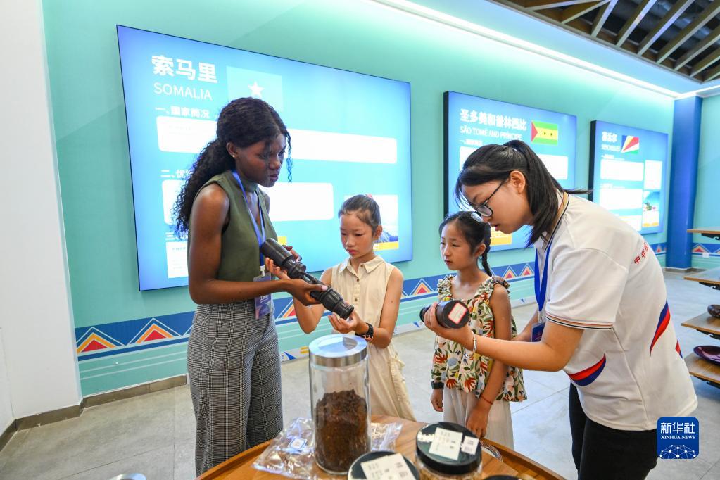 6月30日,在中非經(jīng)貿合作促進(jìn)創(chuàng )新示范園(湖南高橋大市場(chǎng)),來(lái)自赤道幾內亞的志愿者喜樂(lè )(左一)和來(lái)自湖南信息學(xué)院的志愿者袁哲(右一)給前來(lái)參觀(guān)的小朋友講解展品。