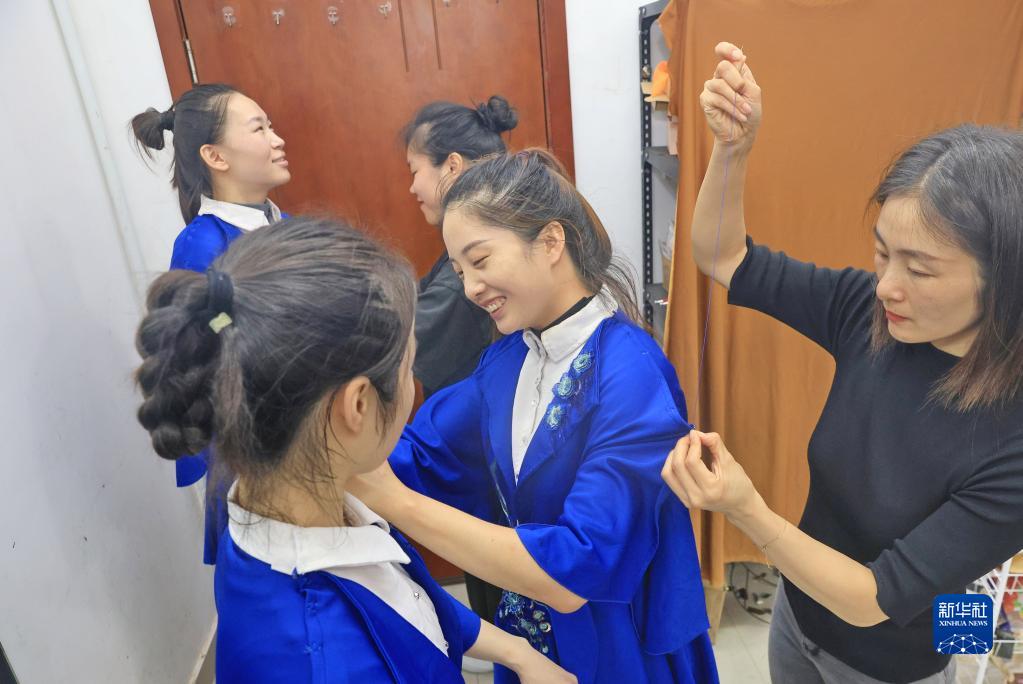 6月30日,如東縣少年雜技團魔術(shù)師丁洋(右一)給同事縫補表演服裝。