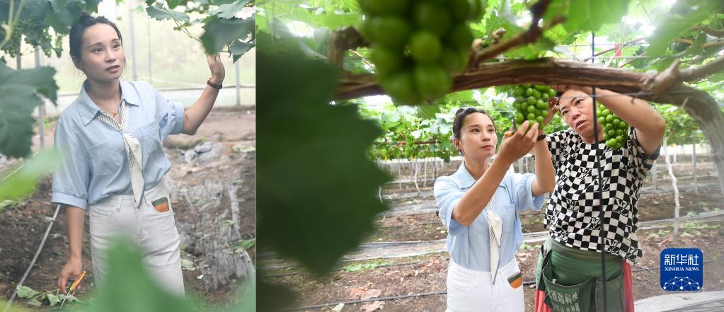 拼版照片:左圖為6月30日,杜涔誠在如東縣虹橋家庭農場(chǎng)葡萄園忙碌;右圖為6月30日,杜涔誠和母親在葡萄園進(jìn)行精品果整修。