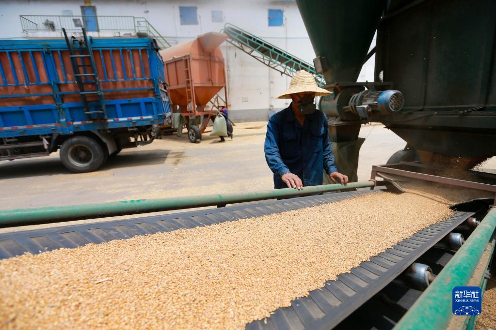 6月30日,在淮北市濉溪縣韓村鎮一家食品企業(yè)夏糧收購現場(chǎng),工人在自動(dòng)化傳輸線(xiàn)旁作業(yè)。
