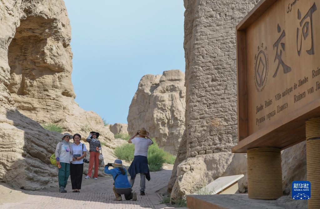 在交河故城內,游客在聽(tīng)古麗拜克熱(左二)講解后與其合影留念(6月26日攝)。
