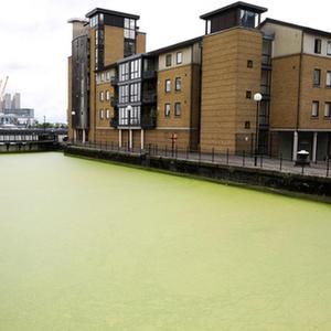 由于當地氣溫升高等原因,英國倫敦泰晤士河畔碼頭的一處水域被浮萍覆蓋。