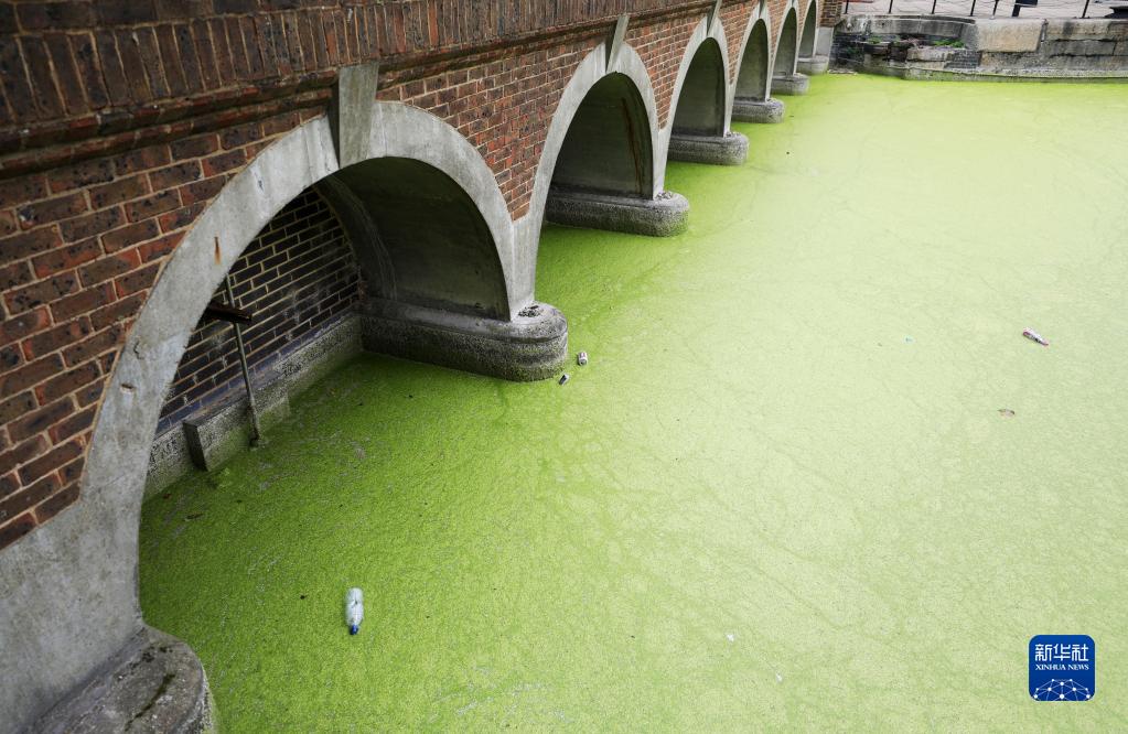 由于當地氣溫升高等原因,英國倫敦泰晤士河畔碼頭的一處水域被浮萍覆蓋。