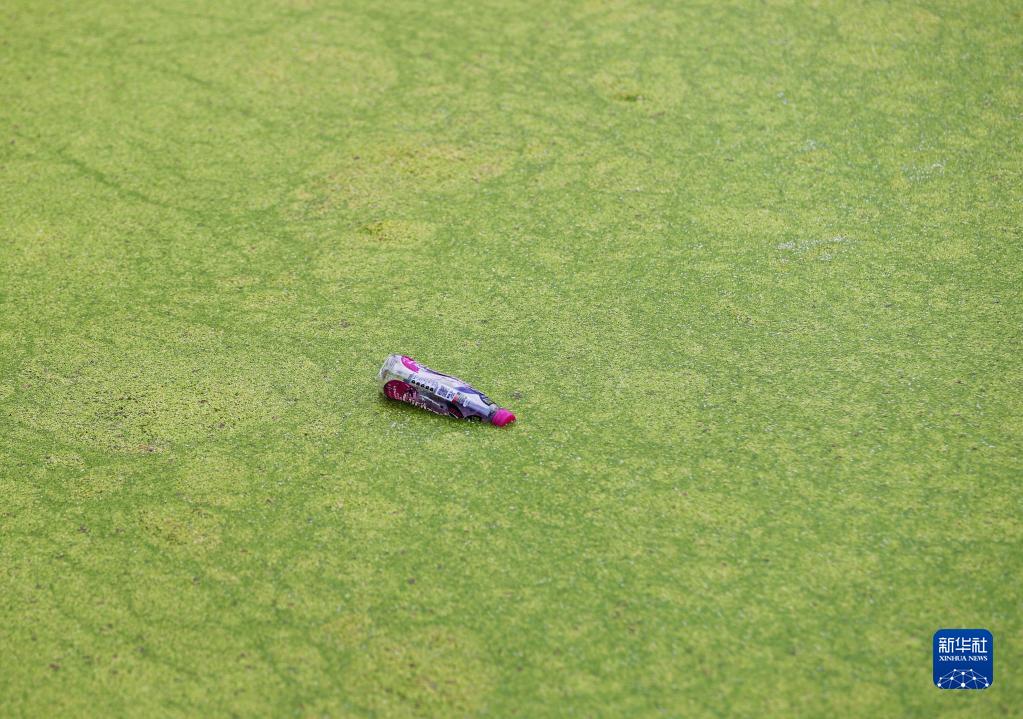 由于當地氣溫升高等原因,英國倫敦泰晤士河畔碼頭的一處水域被浮萍覆蓋。