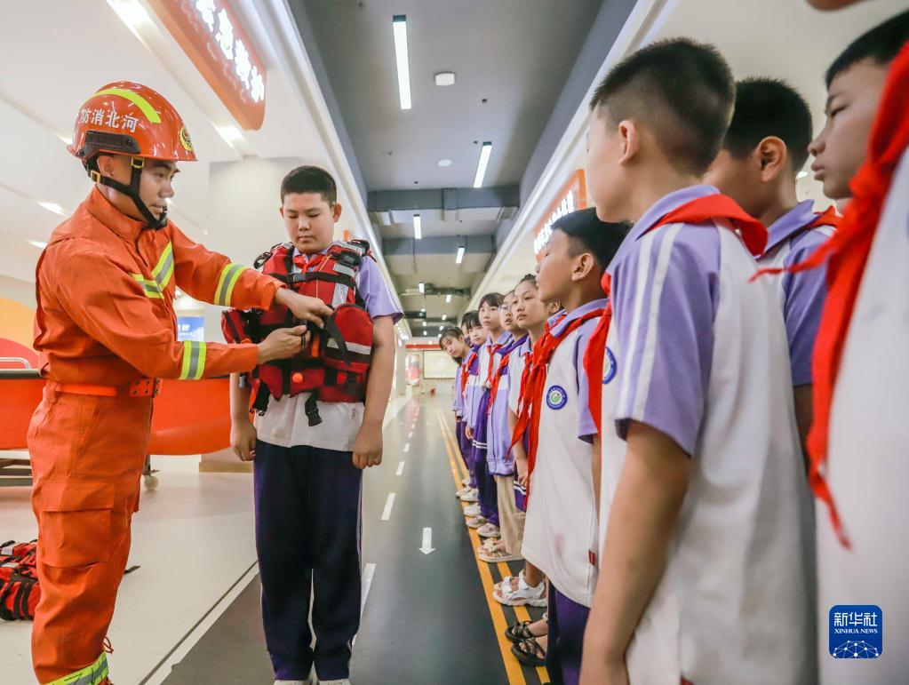 6月30日,消防救援人員指導河北省遵化市第三實(shí)驗小學(xué)的學(xué)生試穿救生衣。