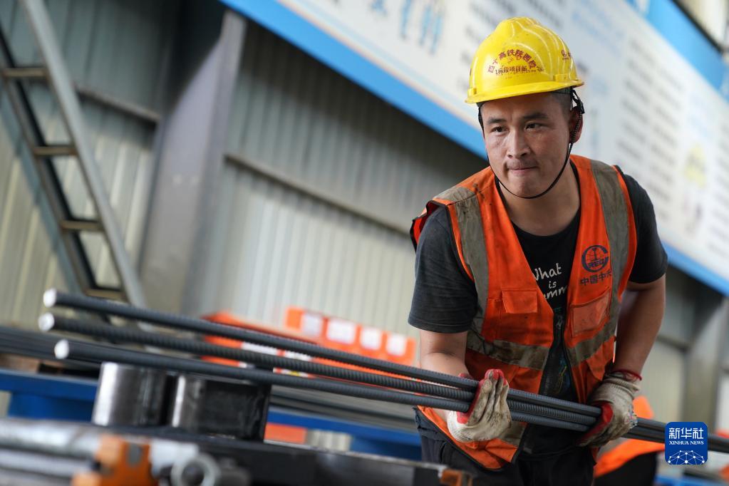 6月30日,施工人員在中鐵上海工程局藍田制梁場(chǎng)加工預制箱梁使用的鋼筋。